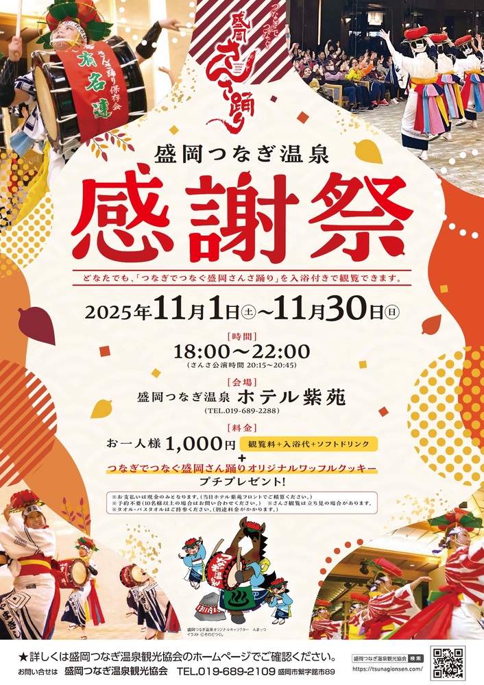 11月は「盛岡つなぎ温泉感謝祭」として、盛岡つなぎ温泉への宿泊者に限らず、どなたでもお得な入浴とセットで「つなぎでつなぐ盛岡さんさ踊り」を楽しむことができます。ぜひお越しください。