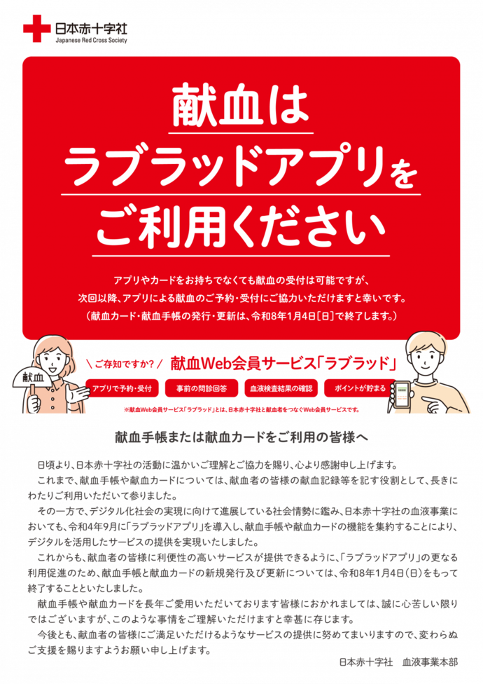 令和8年1月5日(月曜日)から全国の献血会場においては、「ラブラッドアプリ」による献血の受付方法に統一します。