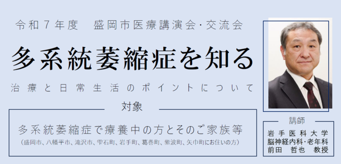 盛岡市、および県央保健所管内の市町で暮らす多系統萎縮症の患者さんと御家族を対象に、医療講演会、相談交流会を開催します。ぜひお申込みください。