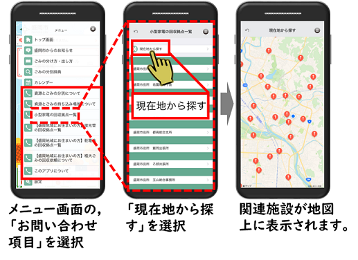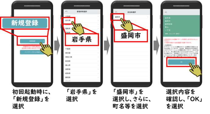 [画像]二次元コード:App Store (iOS版)のQRコード(13.2 KB) [画像]二次元コード:Google Play (Android版)のQRコード(13.1 KB)次の手順で、お住まいの地域を設定してください。お住まいの地域に合わせた収集日程を表示しますので、異なる地域を選択された場合には、正しく表示されない場合があります。(地域の選択は、設定画面から変更することができます。)
