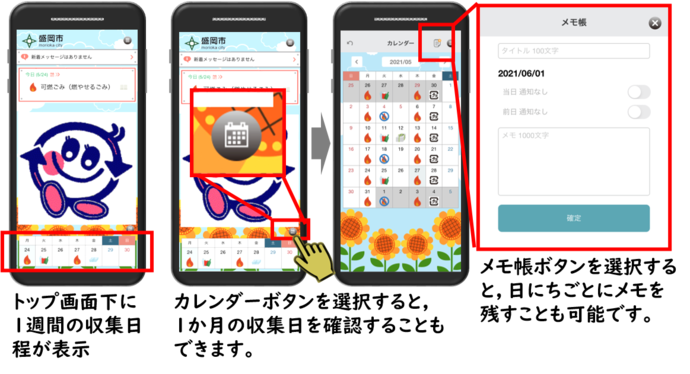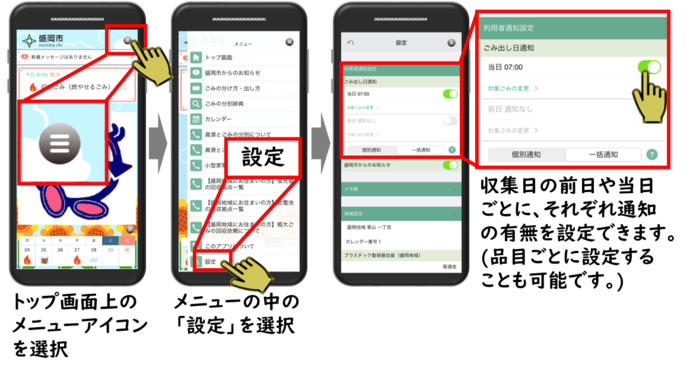 [画像]初期設定の手順(106.8 KB)収集日の前日や当日に通知を受け取ることができます。初期状態では、当日の朝7時に通知が鳴るように設定されています。
