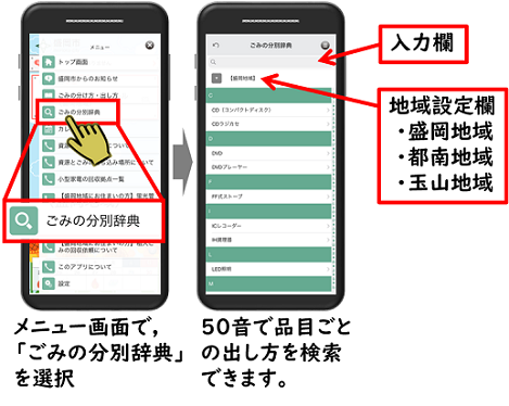 ごみの品目別の出し方を音声で案内します。
